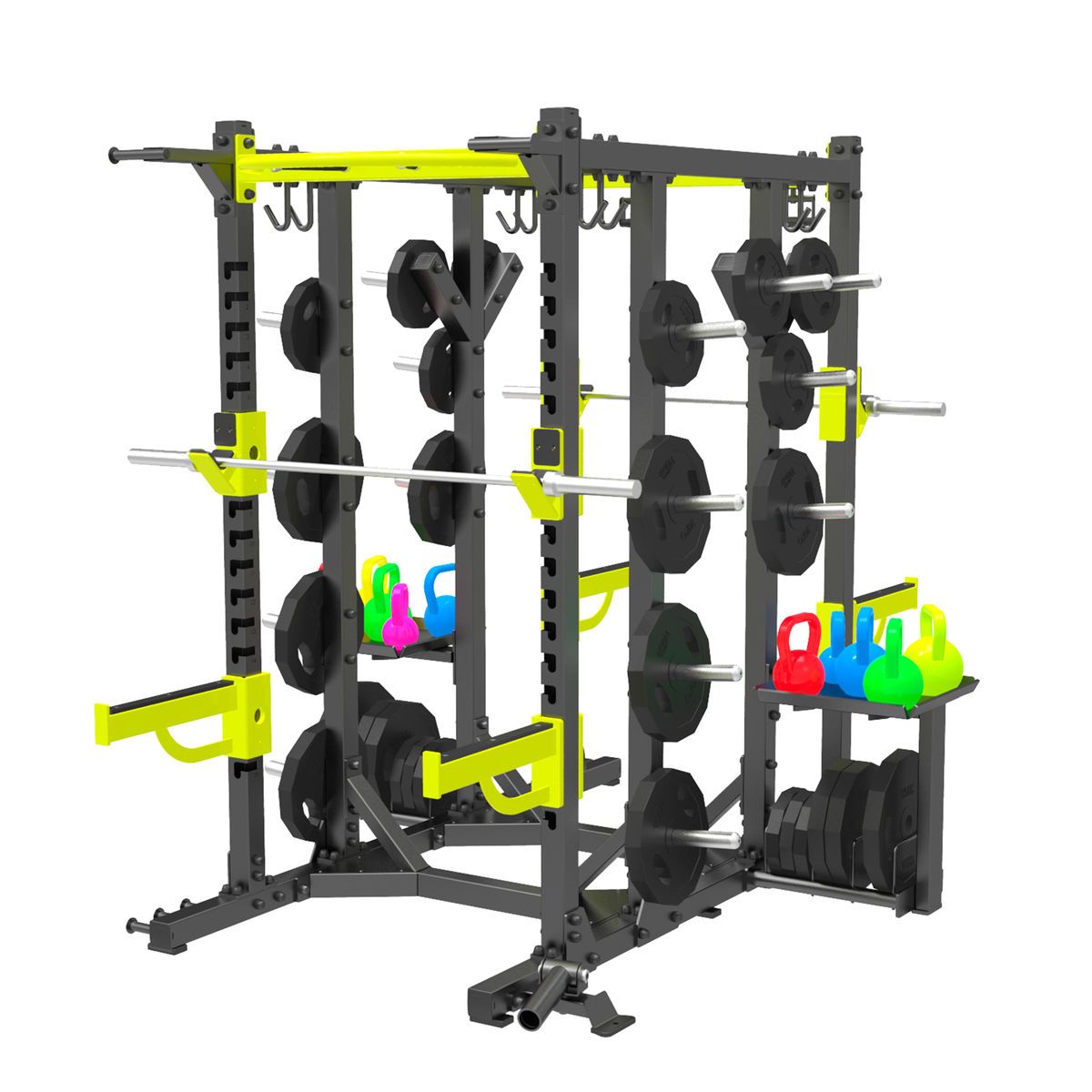 Силовая рама оснащена регулируемыми по высоте страховочными упорами и фиксаторами для штанги, которые можно подстраивать под рост спортсмена или под конкретные тренировки, так же это позволяет установить скамью для выполнения упражнения жим из положений сидя или лежа. Вверху силовой рамы расположен турник. Страховочные упоры сделают упражнения со штангой более безопасными и менее травмоопасными для спортсменов.