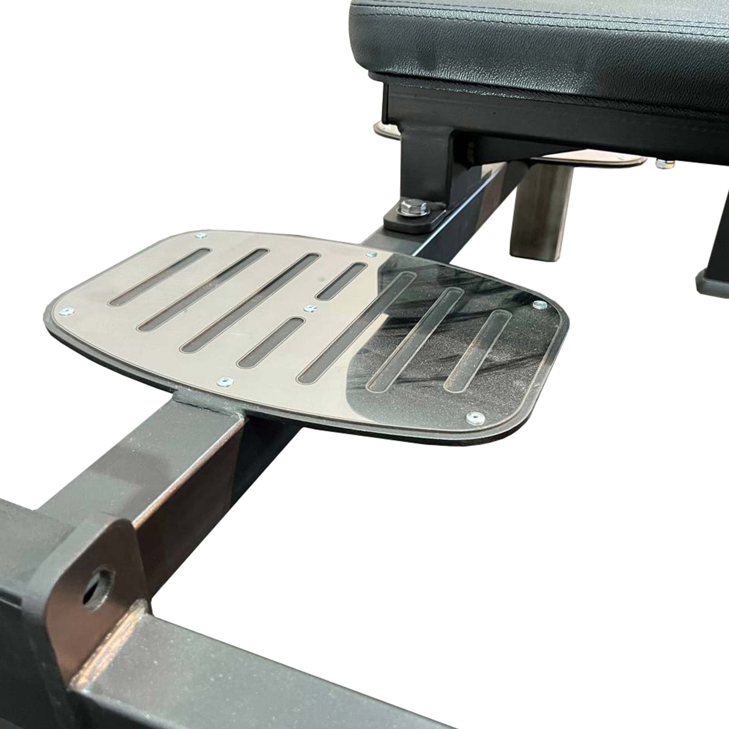 Площадка для страховки выполнена из металла и оснащена противоскользящей рифлёной накладкой из нержавеющей стали.