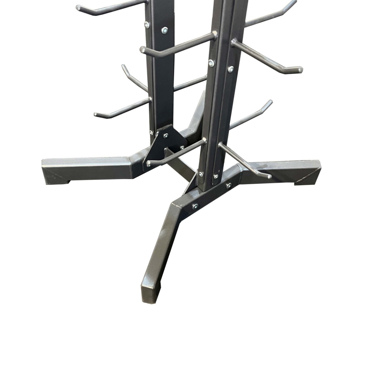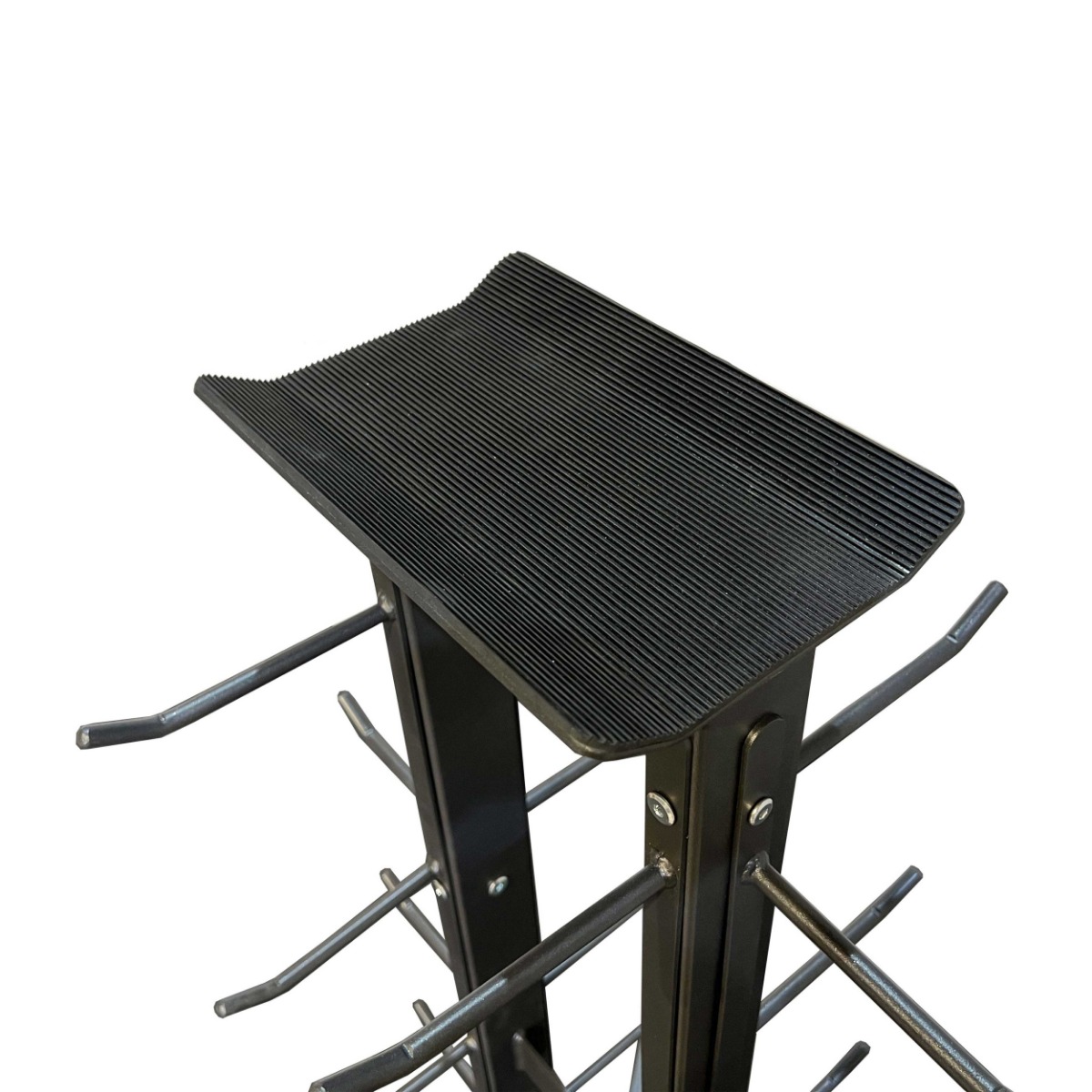 Вертикальная стойка для рукояток и аксессуаров имеет 6 рядов вертикальных держателей-крючков для инвентаря и горизонтальную полку, покрытую резиной, что позволяет ей удерживать большое количество предметов, располагая их на разных уровнях.