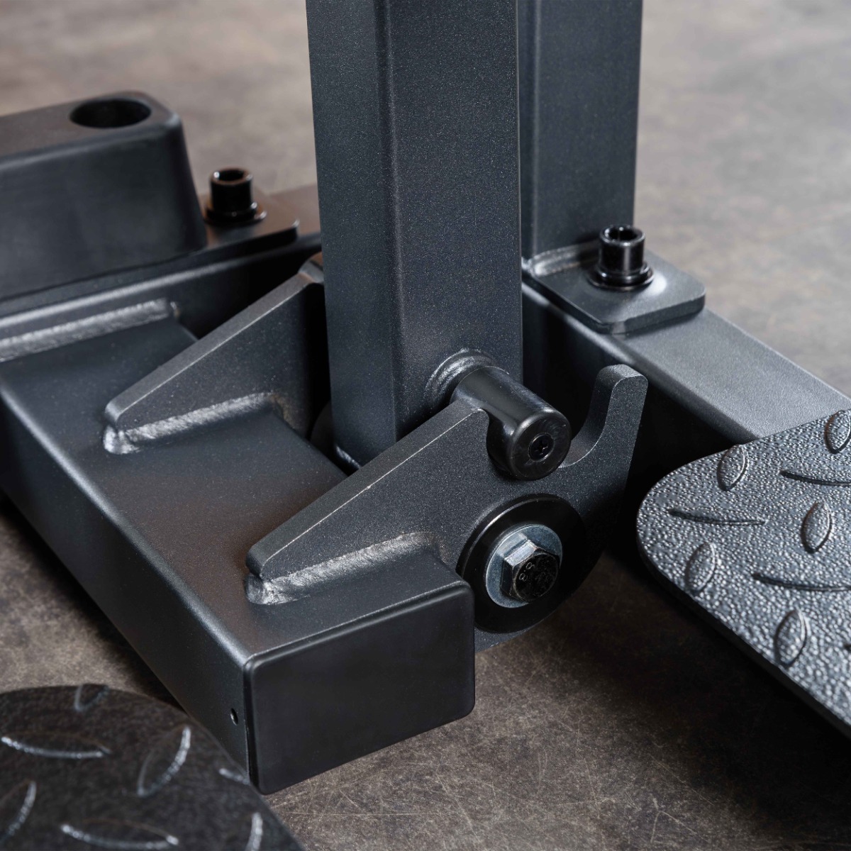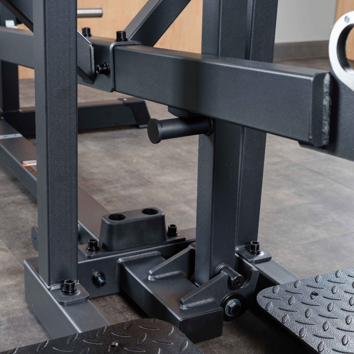 Опорные ножки тренажера оборудованы пластиковыми накладками для устойчивого положение и безопасного подхода к тренажеру.