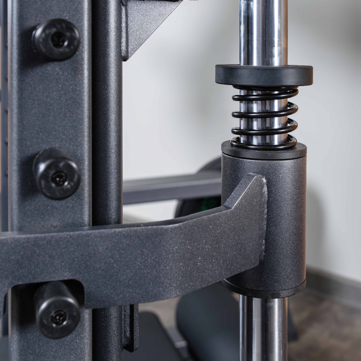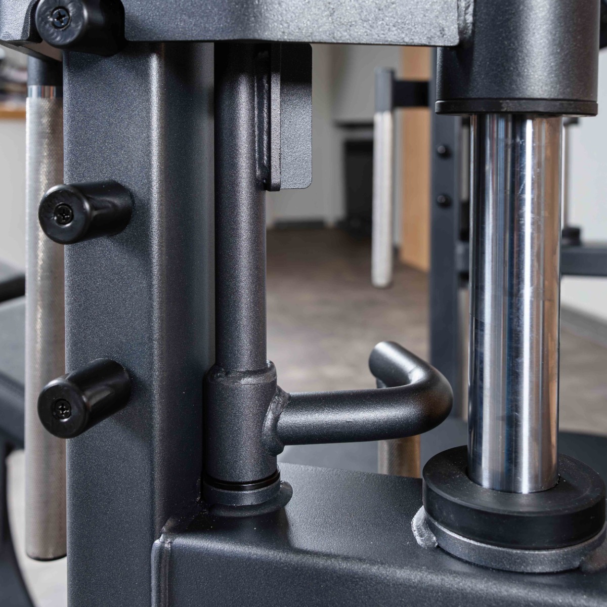 На раме тренажера установлены рукояти с двумя парными вертикальными металлическими упорами (фиксаторами) с резиновыми отбойниками для амортизации при завершении подхода. Вертикальное расстояние между упорами 250 мм.