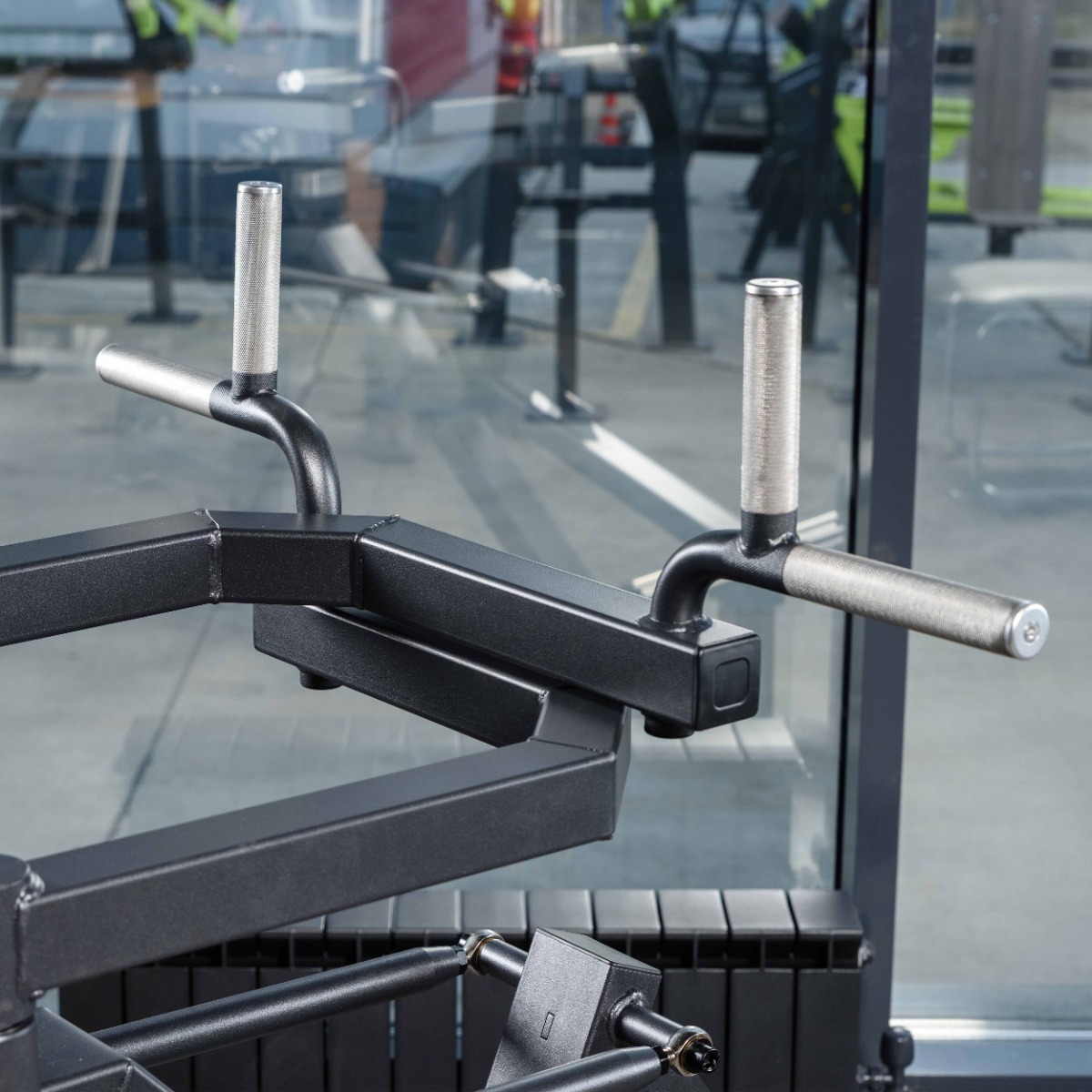 На каждом рычаге установлены две рукояти – вертикальная и горизонтальная. Вертикальные рукояти длиной 115 мм предназначены для акцентированной проработки трапециевидных мышц, горизонтальные рукояти длиной 150 мм – для изолированной нагрузки на задние пучки дельтовидных. Диаметр рукоятей 30 мм, рабочие зоны покрыты мягкой ромбовидной накаткой. Торцы оборудованы металлическими заглушками, зафиксированными болтовым соединением.