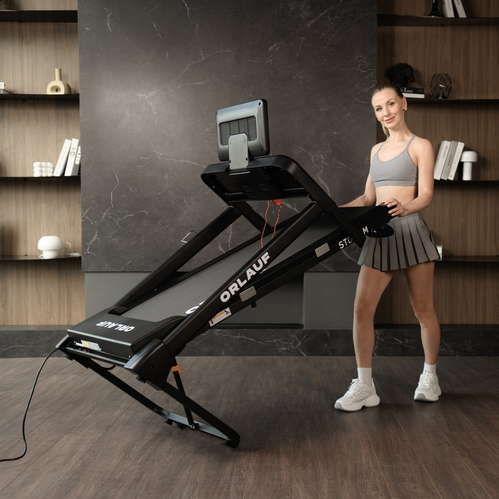 Электрическая беговая дорожка Orlauf Stork M открывает новый уровень домашних тренировок, сочетая эффективность, комфорт и безупречное качество. Модель отличается инновационной горизонтальной системой складывания с газлифтом Raiser™, которая обеспечивает легкое и безопасное преобразование тренажера в компактную форму.