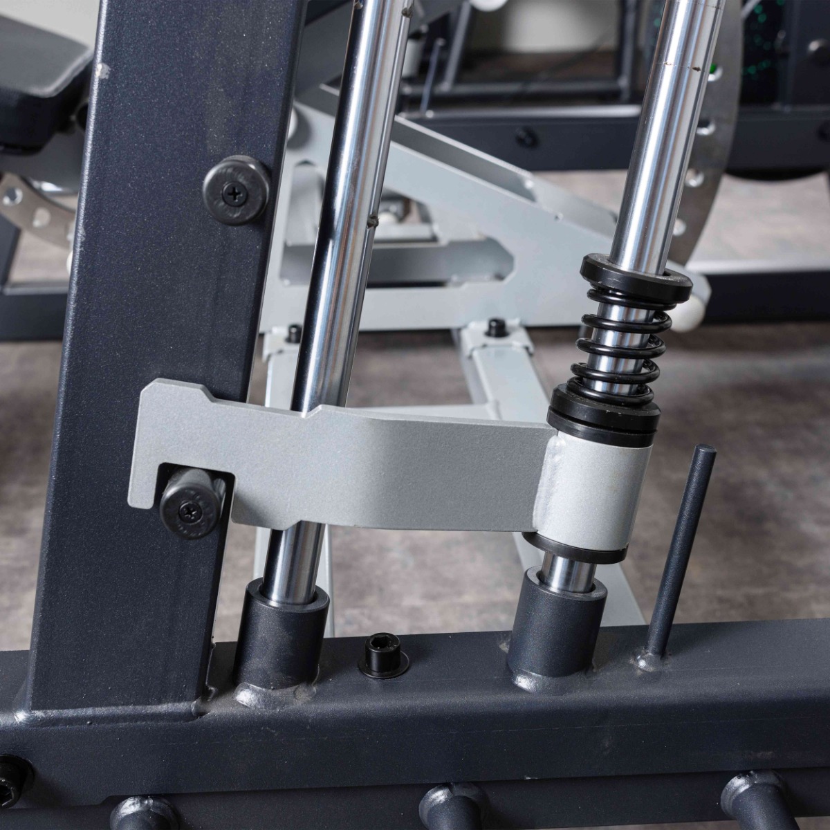 Накопители для хранения и работы со свободными весами оборудованы кольцами из плотной резины для предотвращения соприкосновения дисков с рамой тренажера.