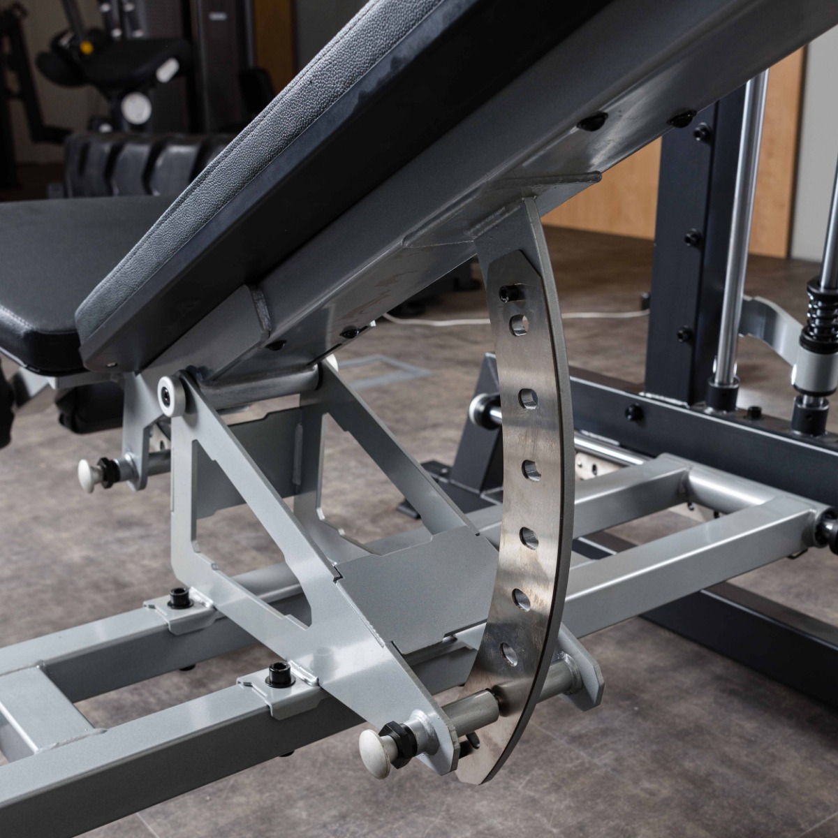 На раме тренажера установлено шесть хромированных накопителей из толстостенной стальной трубы для хранения свободных весов и два на подвижных рычагах.