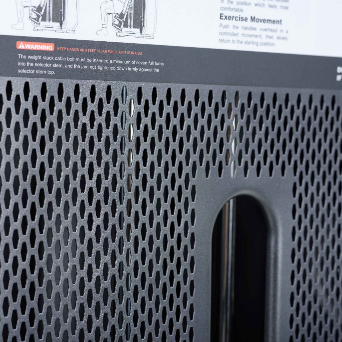 Прорезь в защитном кожухе грузоблока для доступа к регулировке нагрузки шлифованная с завальцованными внутрь гранями по всему периметру для безопасного доступа к весовому стеку и обеспечения дополнительной жёсткости рамы грузоблока.