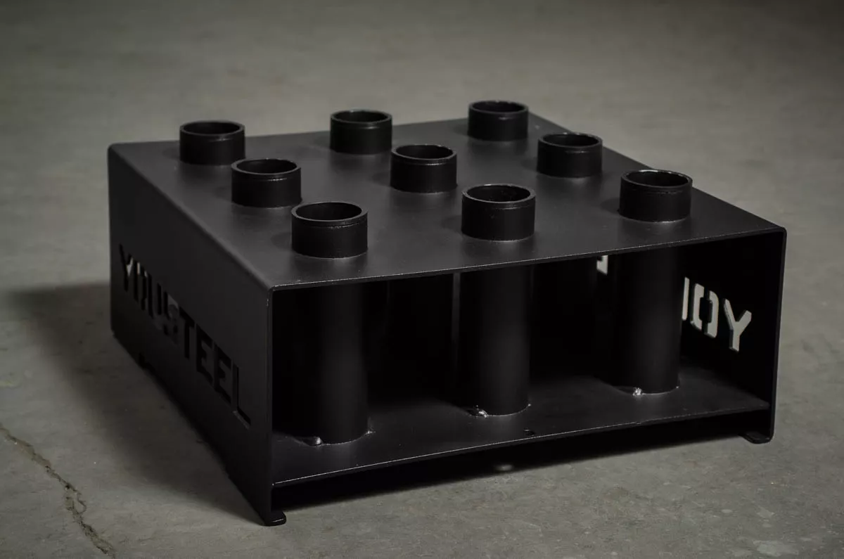 Напольная подставка для вертикального хранения грифов отличный вариант для клубов, где нет возможности крепить кронштейны к стенам. С этой подставкой вы сможете компактно разместить 9 грифов и они займут минимум места. Подставка для грифов выполнена из листа металла, на который наварены трубы диаметром 60мм для удержания грифов. Верхний край труб покрыт пластиковой накладкой, которая защитит рукава грифа при интенсивном использовании.