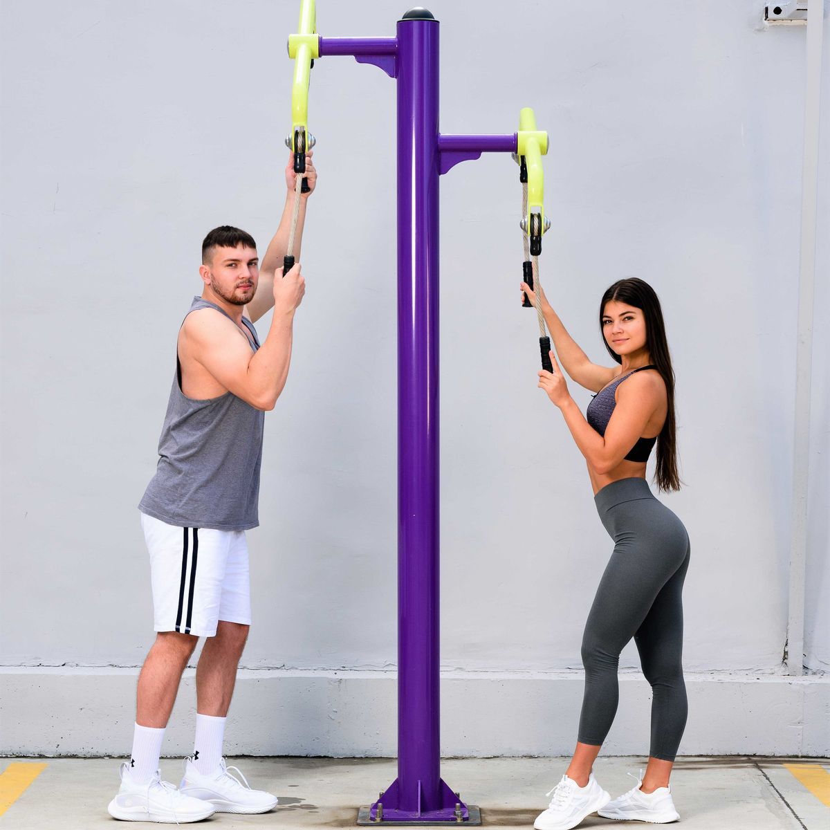 Рычаги с прочным канатом и эргономичными рукоятями с обрезиненным покрытием изготовлены из стальной трубы диаметром 48 мм с толщиной стенки 3,5 мм. Рычаги закреплены на столбе через поворотные узлы, что позволяет выполнять упражнения с естественной амплитудой движения