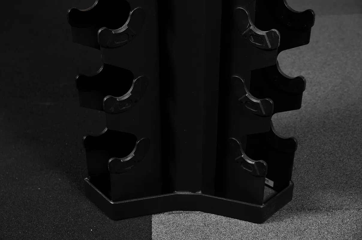 Стойка способна вместить 10 пар гантелей, весом от 1 до 10кг. Ложементы обрамлены пластиком и предотвратят повреждения рукоятей гантелей. Это отличный компактный вариант с габаритными размерами 450х257х1387мм