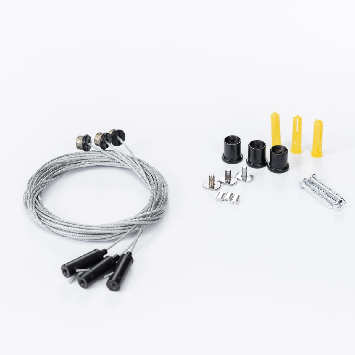 Тип установки: подвесной. В комплект входит три регулируемых троса длиной по 2,5 м и крепления. Это обеспечивает надёжную фиксацию и гибкость при монтаже на различных высотах.