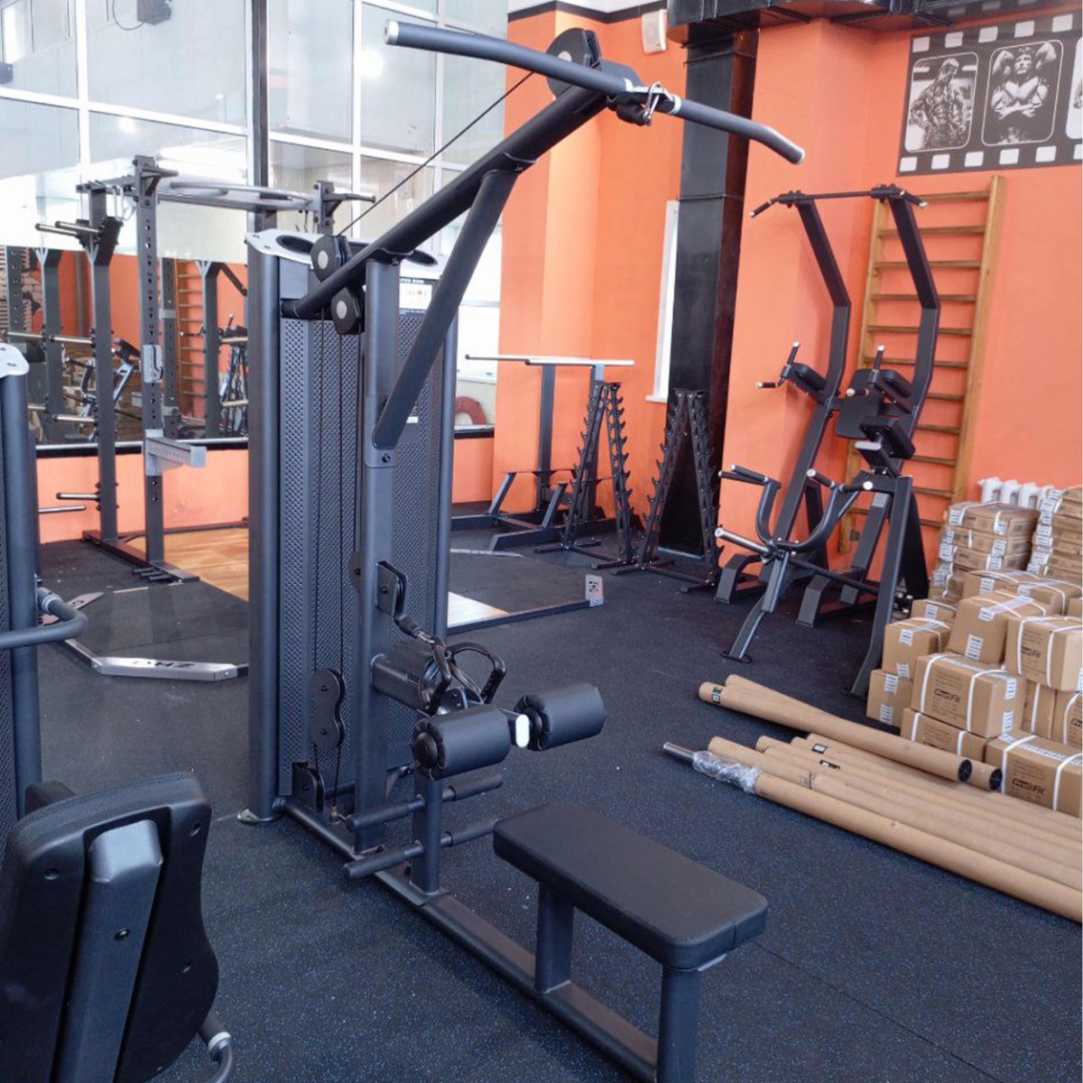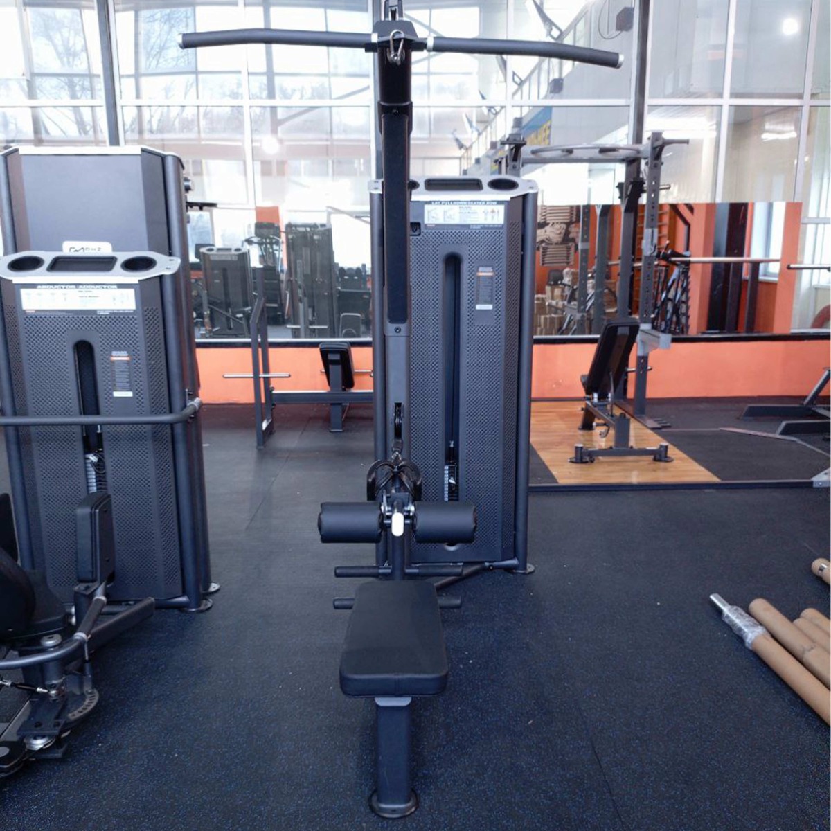 Рукоятки для упражнения Тяга сверху и четыре опоры для ног выполнены из металлической трубы с нескользящим резиновым покрытием. Торцы закрыты декоративными алюминиевыми заглушками.