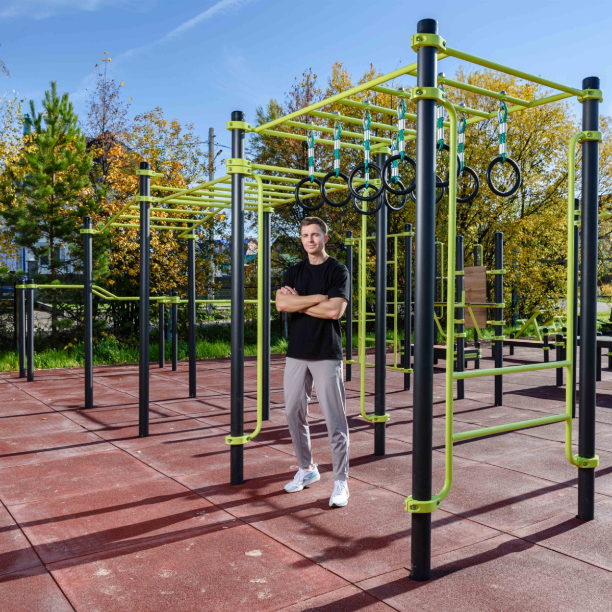 Рукоходы классический и в подъём, рукоход с кольцами, перекладины вертикальные и низкая шведская стенка выполнены из металлической трубы диаметром 34 мм с толщиной стенки 3,2 мм.