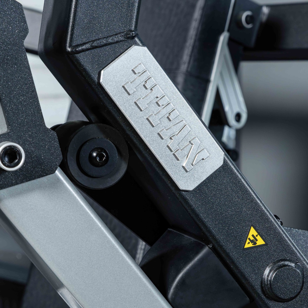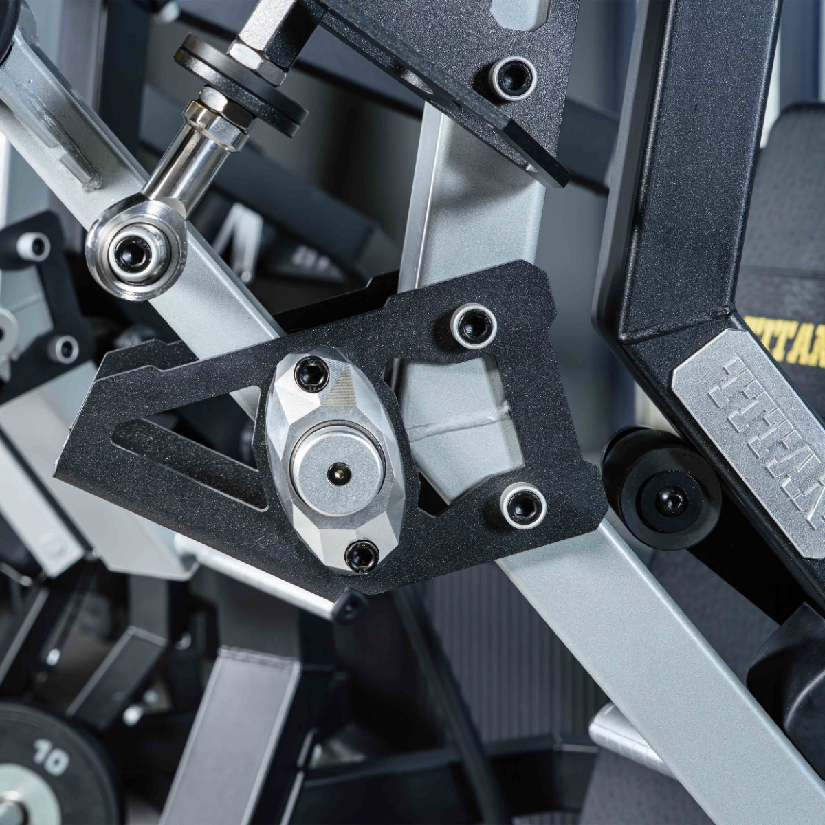 На подвижных рычагах для работы со свободными весами установлено два литых хромированных накопителя из толстостенной стальной трубы для дисков с посадочным диаметром 50 мм.